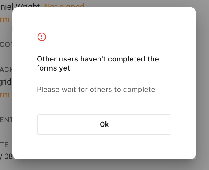 Når jeg prøver å signere rapporten, møter jeg feilmeldingen "Andre brukere har ikke fullført skjemaene ennå", til tross for at jeg har fullført min del av rapporten.