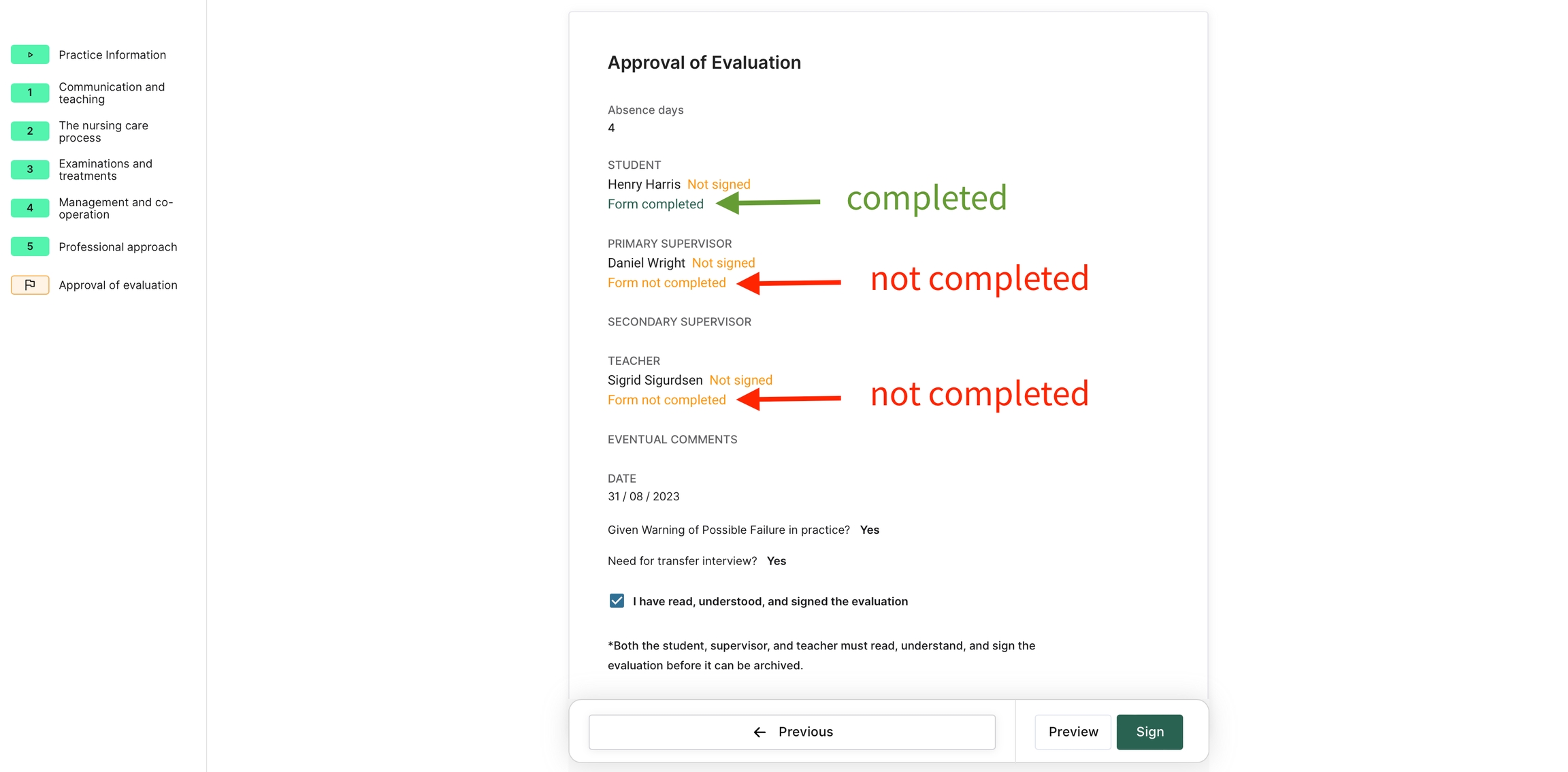Å signere rapporten er avhengig av at alle relevante seksjoner er fullført av andre parter. Når alle parter har oppfylt sine forpliktelser, vil du motta varsler og SMS-varsler som indikerer klarhet for signatur. For å følge fremgangen, kan du enkelt identifisere hvem som ennå ikke har fullført sine seksjoner innenfor "Godkjenning av evaluering" -stadiet.