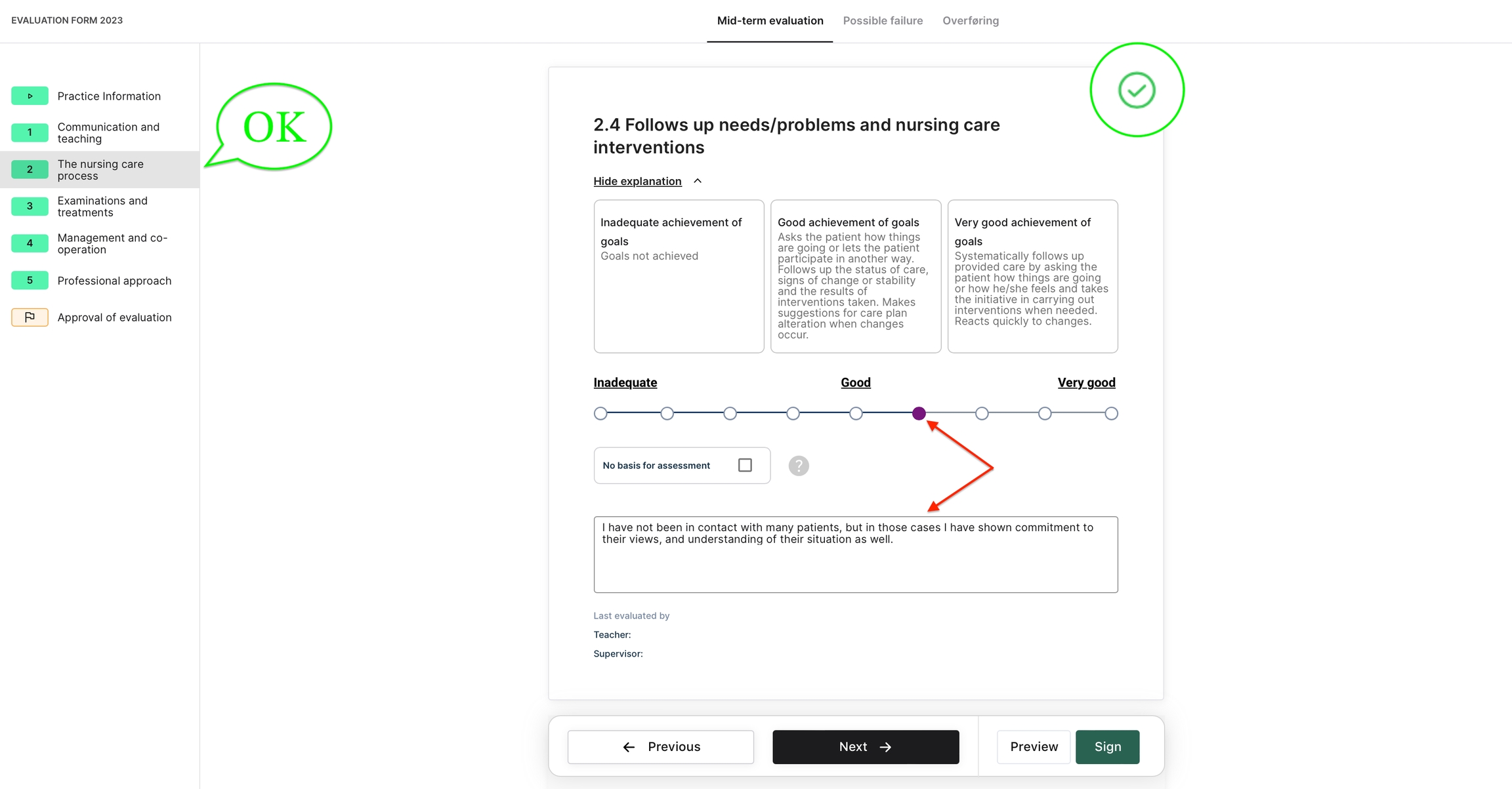 Problem: Inn ute i stand til å signere evaluerings skjemaet og mottak av feilmelding om ufullstendig skjema.