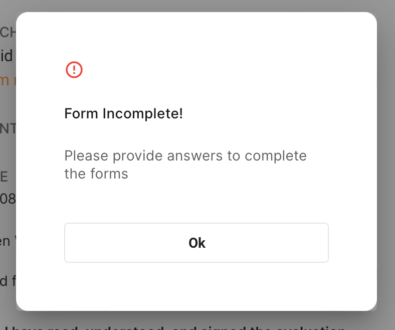 Etter å ha klikket på "Signer" -knappen for å fullføre skjemaet, vil eventuelle ubesvarte spørsmål utløse en feilmelding.