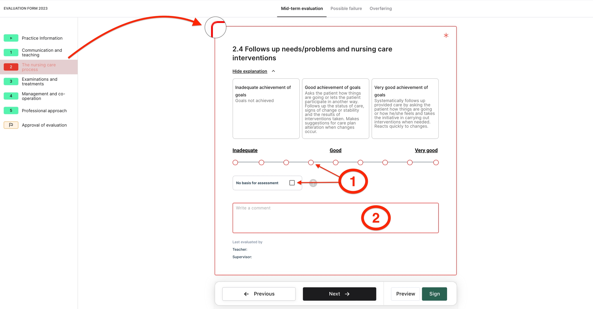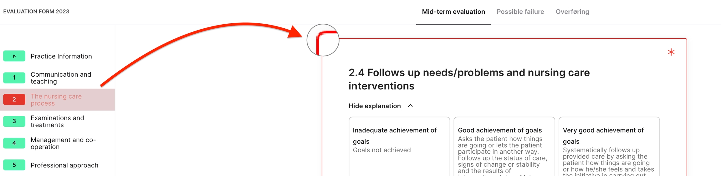 Ingen poengsum kan være tildelt på vurderingsskalaen, eller hvis det ikke er grunnlag for vurdering, kan boksen "Ingen grunnlag for vurdering" ikke være sjekket.