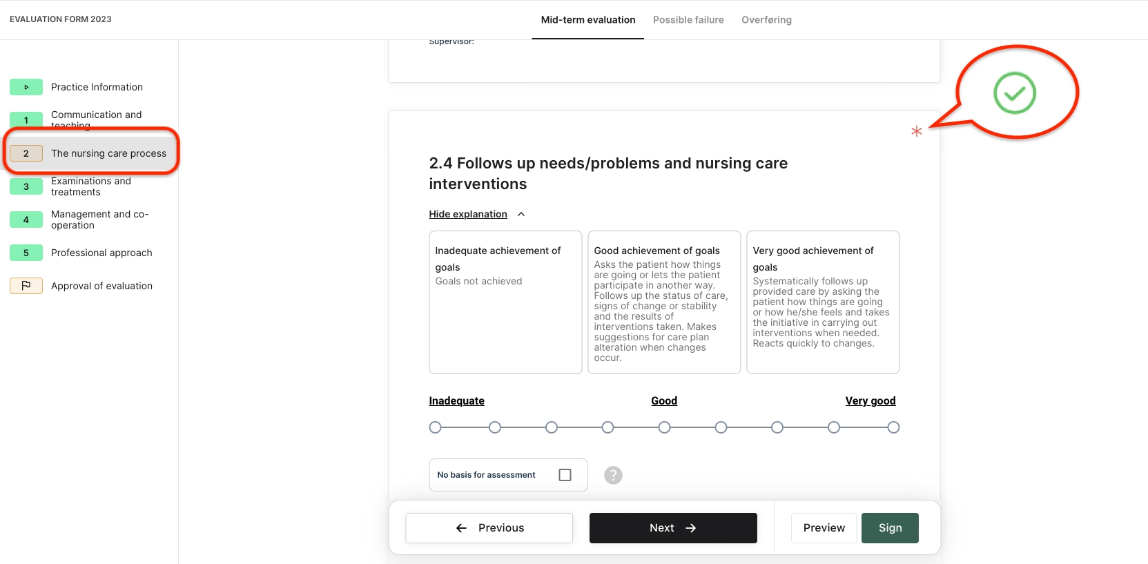 I den venstre navigasjonsmenyen vil hovedspørsmålsgruppen forbli oransje og vil ikke gå tilbake til grønt. Når du går inn i denne seksjonen, vil du innenfor spørsmålsgruppen raskt identifisere eventuelle ubesvarte spørsmål ved den røde asterisken i begynnelsen av hvert spørsmål. Problemet kan løses ved å tildele en poengsum og gi en tilsvarende kommentar.