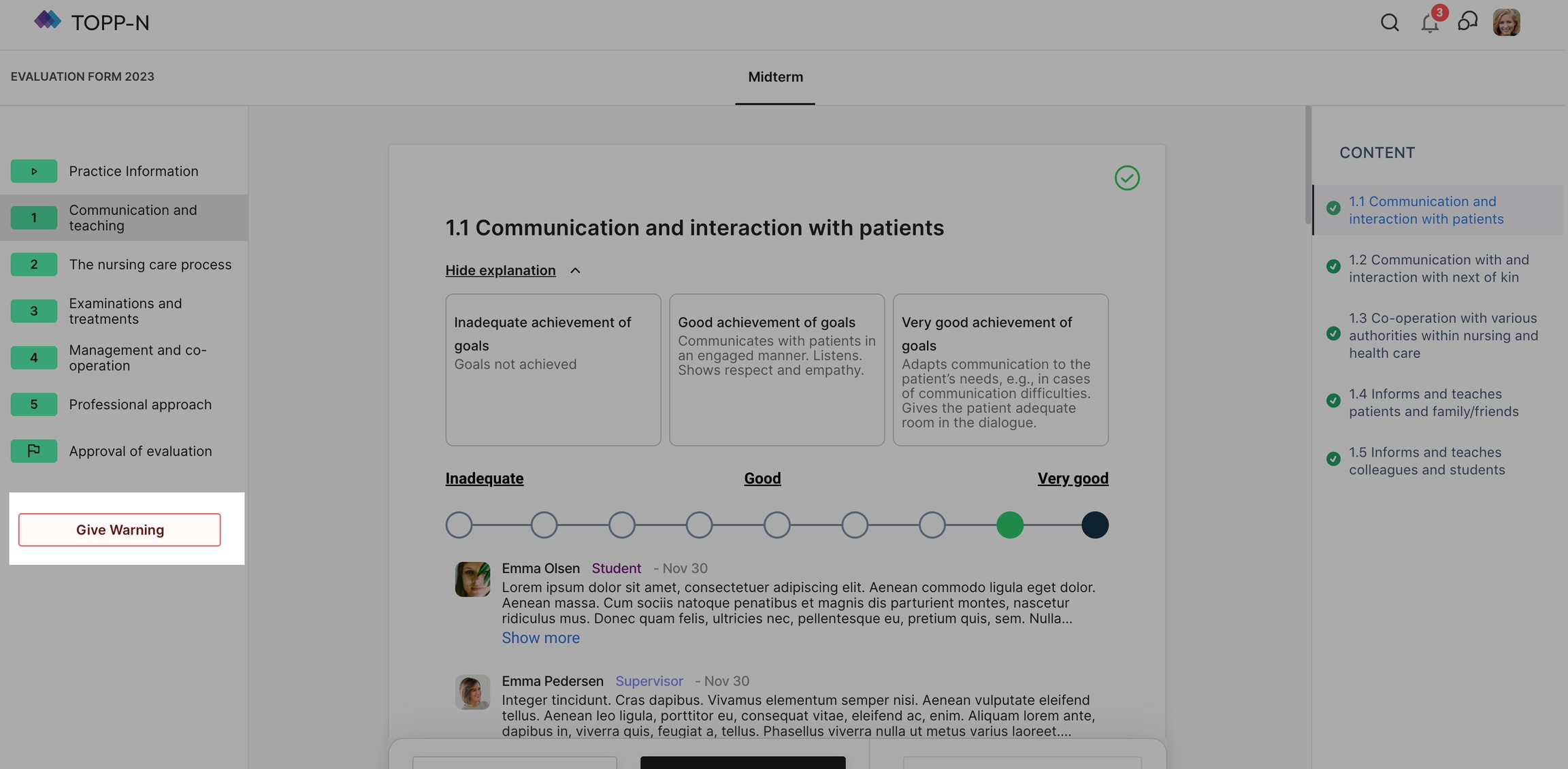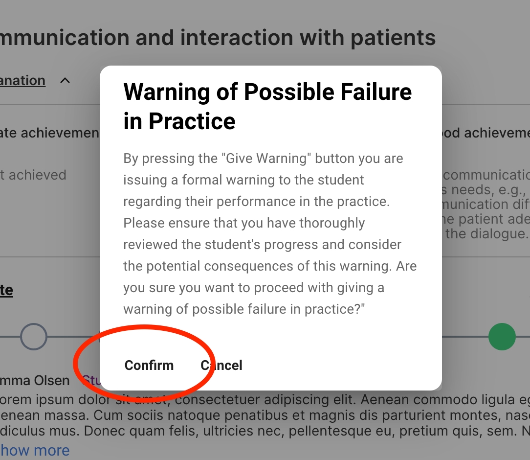 For å generere dette skjemaet, klikk på knappen 'Gi advarsel' på venstre side av studentvurderingsskjemaet. Dette kan gjøres når som helst, fra opprettelsen av midtveisvurderingsskjemaet til signeringen av det endelige vurderingsskjemaet.