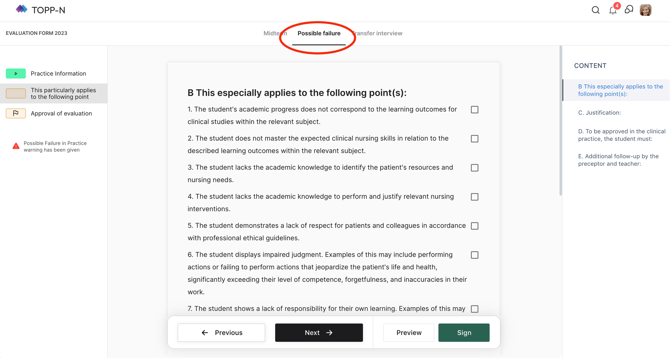 Deretter klikker du på skjemaets navn øverst og fyller ut de påkrevde feltene. Signering av skjemaet vil publisere det med andre parter (studenter og veiledere). I tillegg blir det automatisk generert en overføringssamtaleskjemaet sammen med dette advarselsskjemaet.