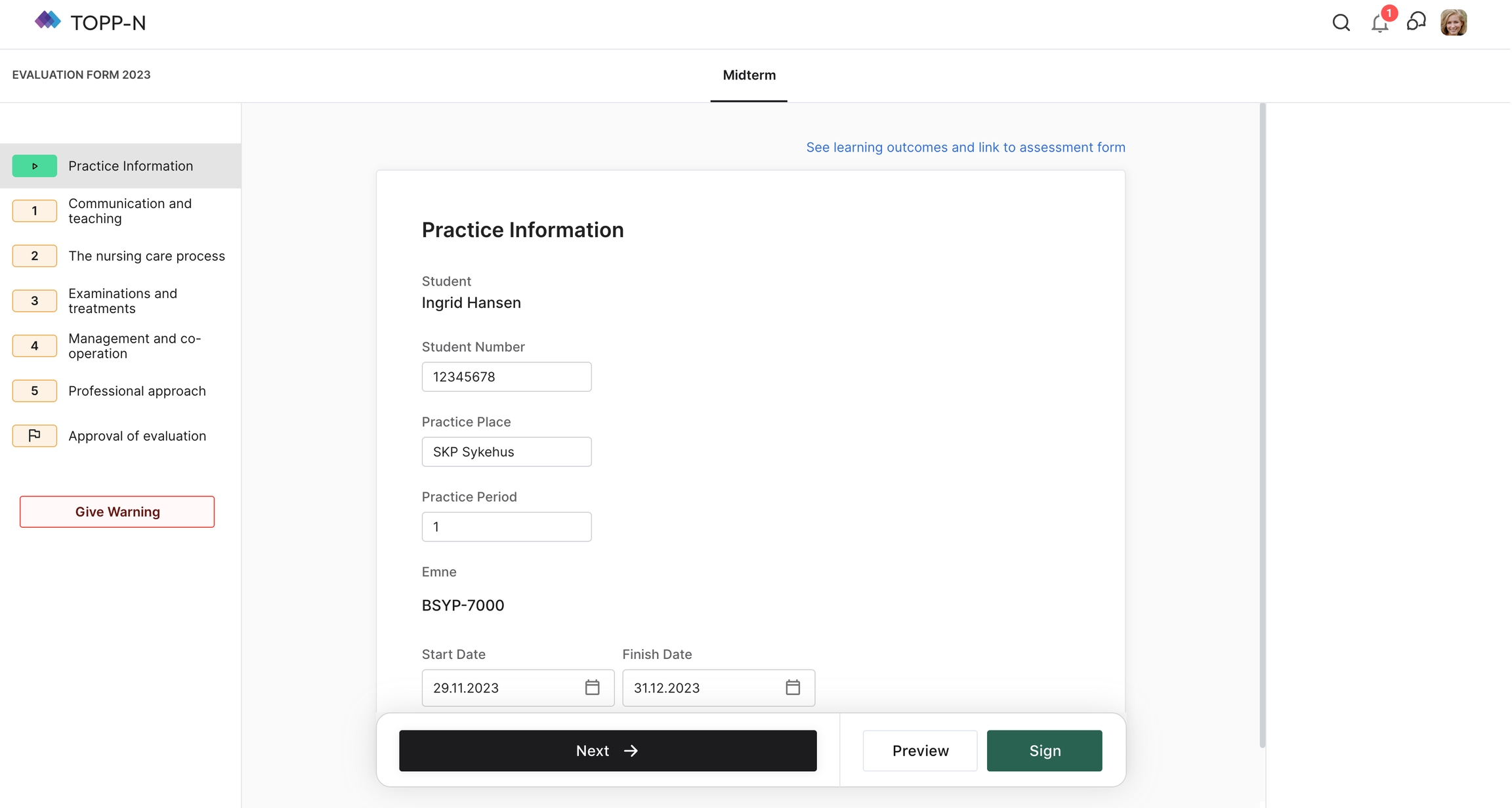 Som lærer som går gjennom vurderingsrapporten, vil du støte på delen "Praksisinformasjon", som administreres av praksislæreren. Denne seksjonen inneholder viktige detaljer om praksis som du bør gjennomgå og fylle ut manglende felt.