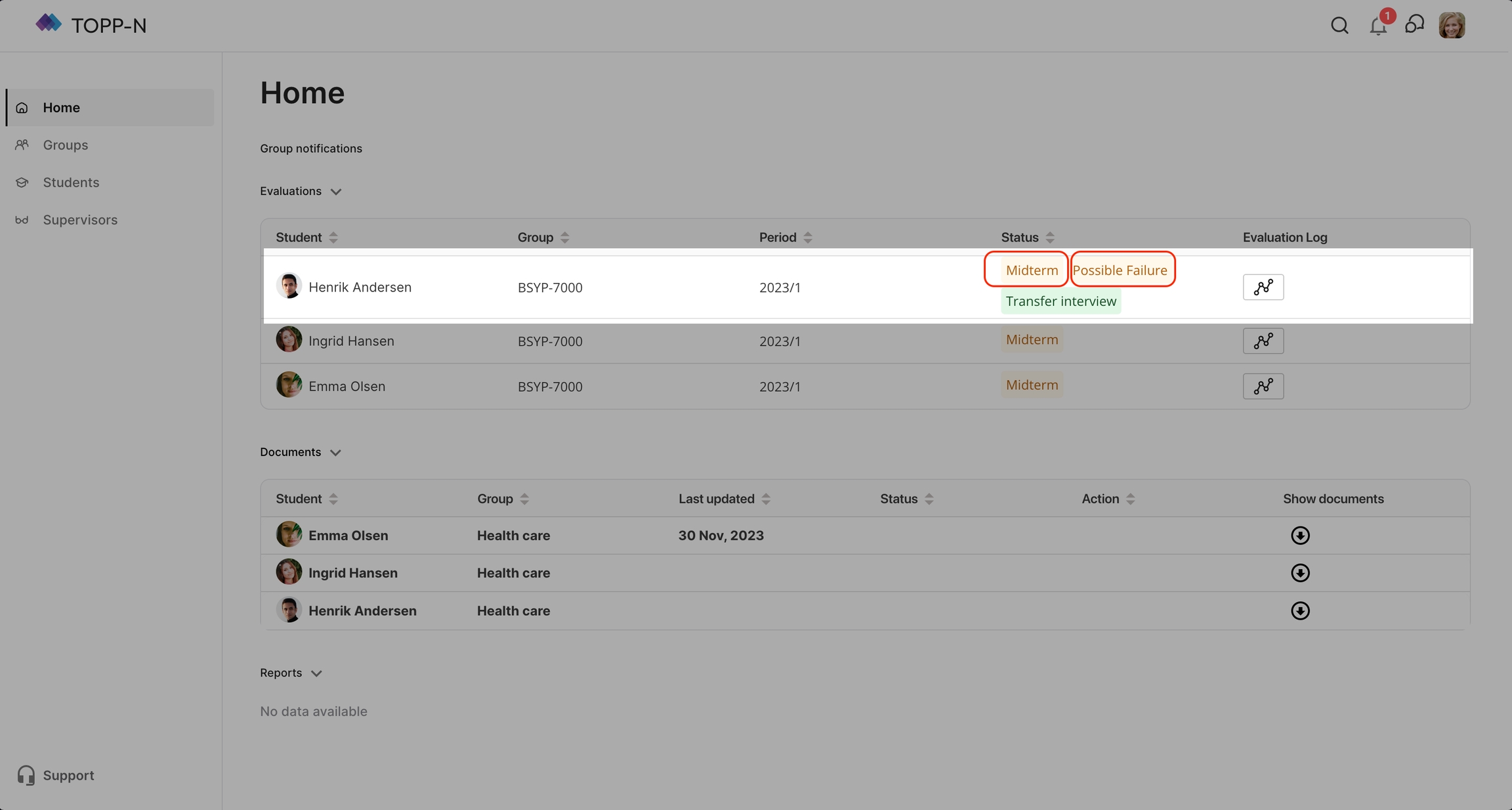 Under "Status," velg en spesifikk fase (f.eks. Midtveis, Slutt) for å bli dirigert til vurderingssiden, eller klikk på hele kortet for å få tilgang til den siste fasen for den ønskede studenten.