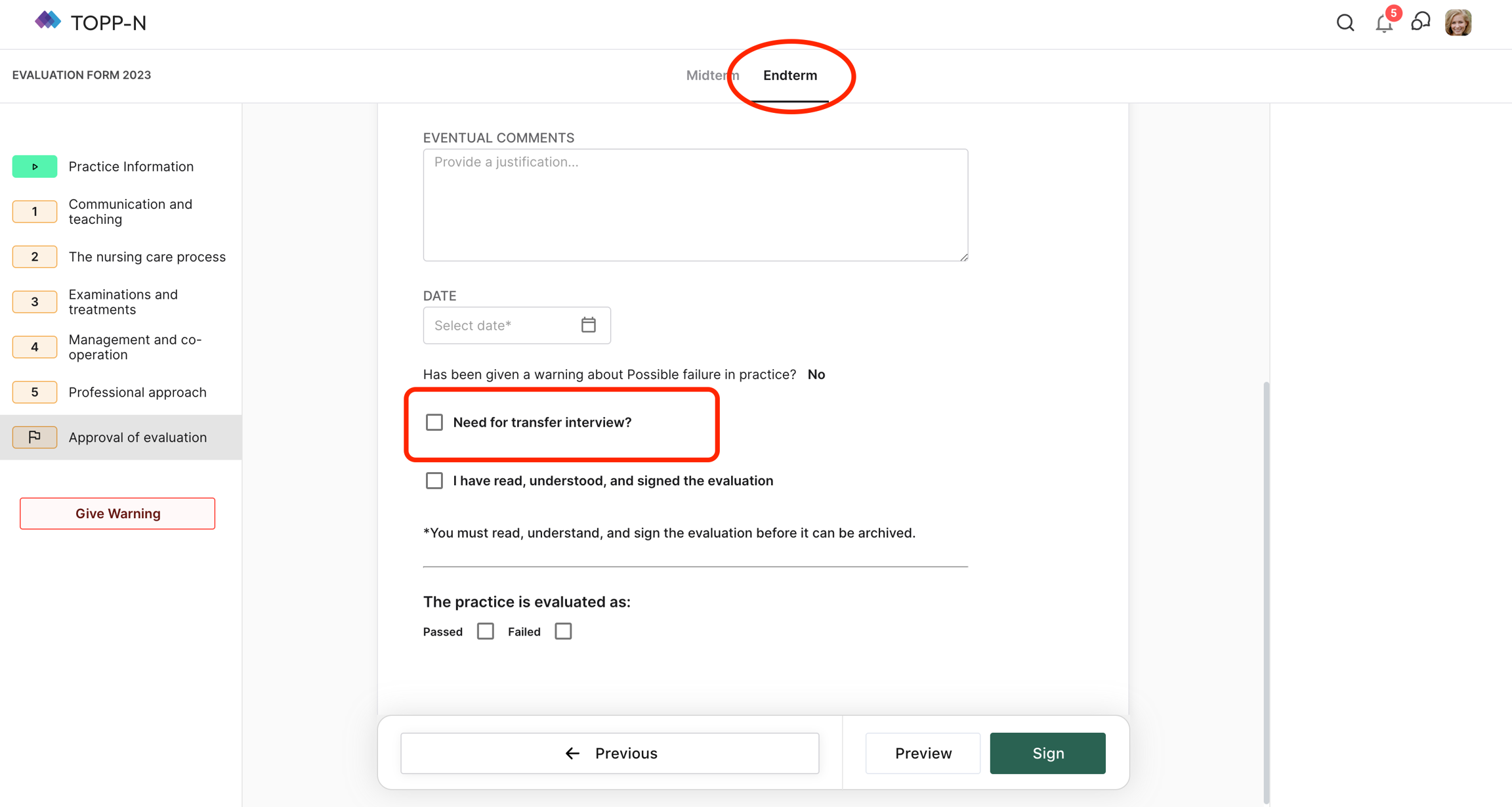 I tilfeller der skjemaet for mulig praksisfeil ikke er generert under midtveisvurderingen eller slutvurderingen, kan Overføringssamtaleskjemaet uavhengig genereres under slutvurderingen. Dette gir mulighet for en dedikert vurdering ved avslutningen av praksisopplæringen eller internship-opplevelsen.