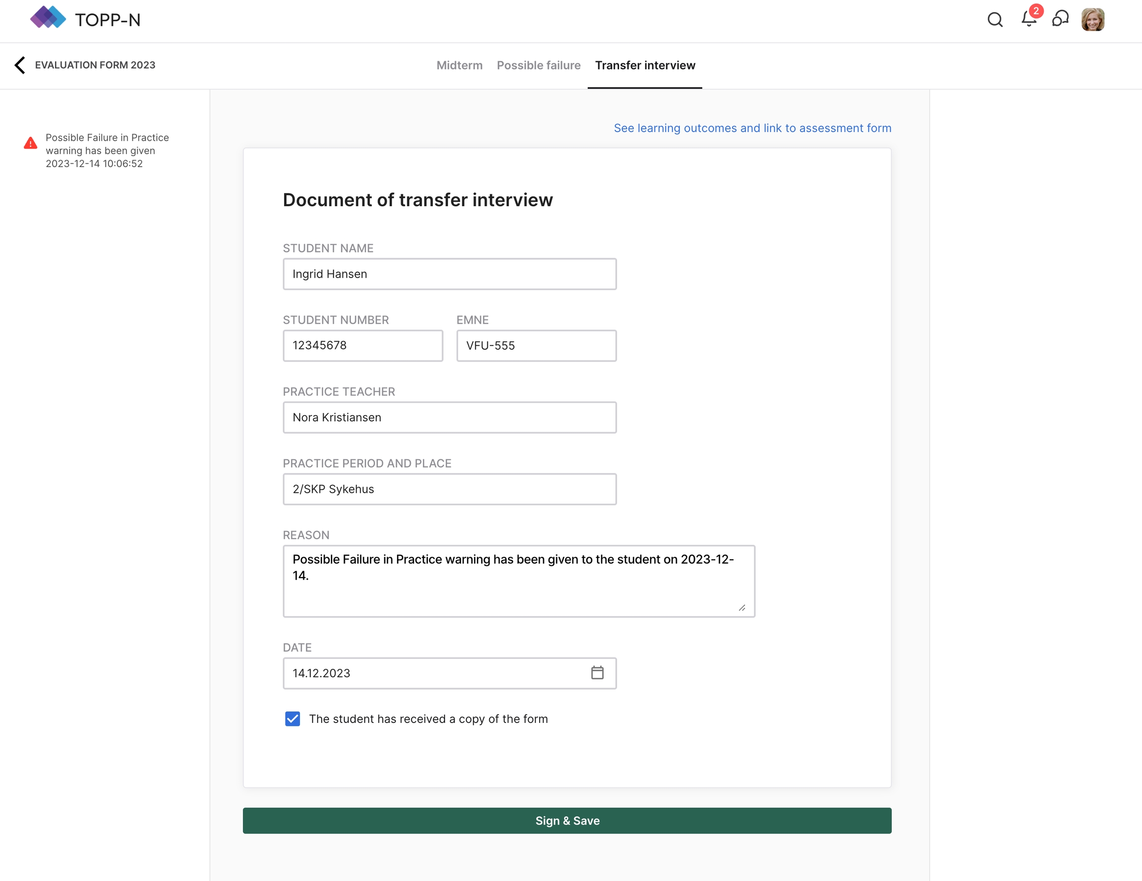 Hvis det opprettes et skjema for mulig praksisfeil under midtveisvurderingen eller slutvurderingen, genereres Overføringssamtaleskjemaet automatisk. Dette sikrer at eventuelle bekymringer om studentens ytelse blir grundig adressert.