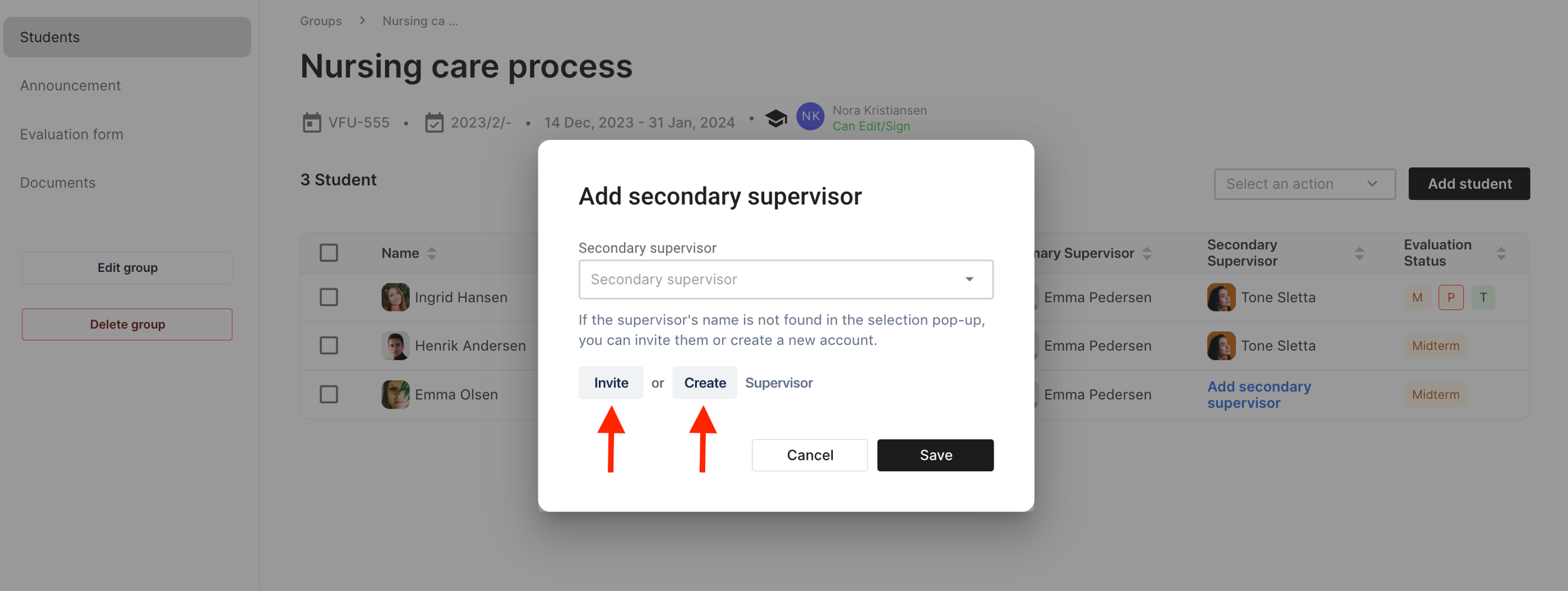 Velg den ønskede gruppen og klikk på 'Legg til hoved-/sekundærveileder'-knappen ved siden av studentens navn på 'Studenter'-fanen.