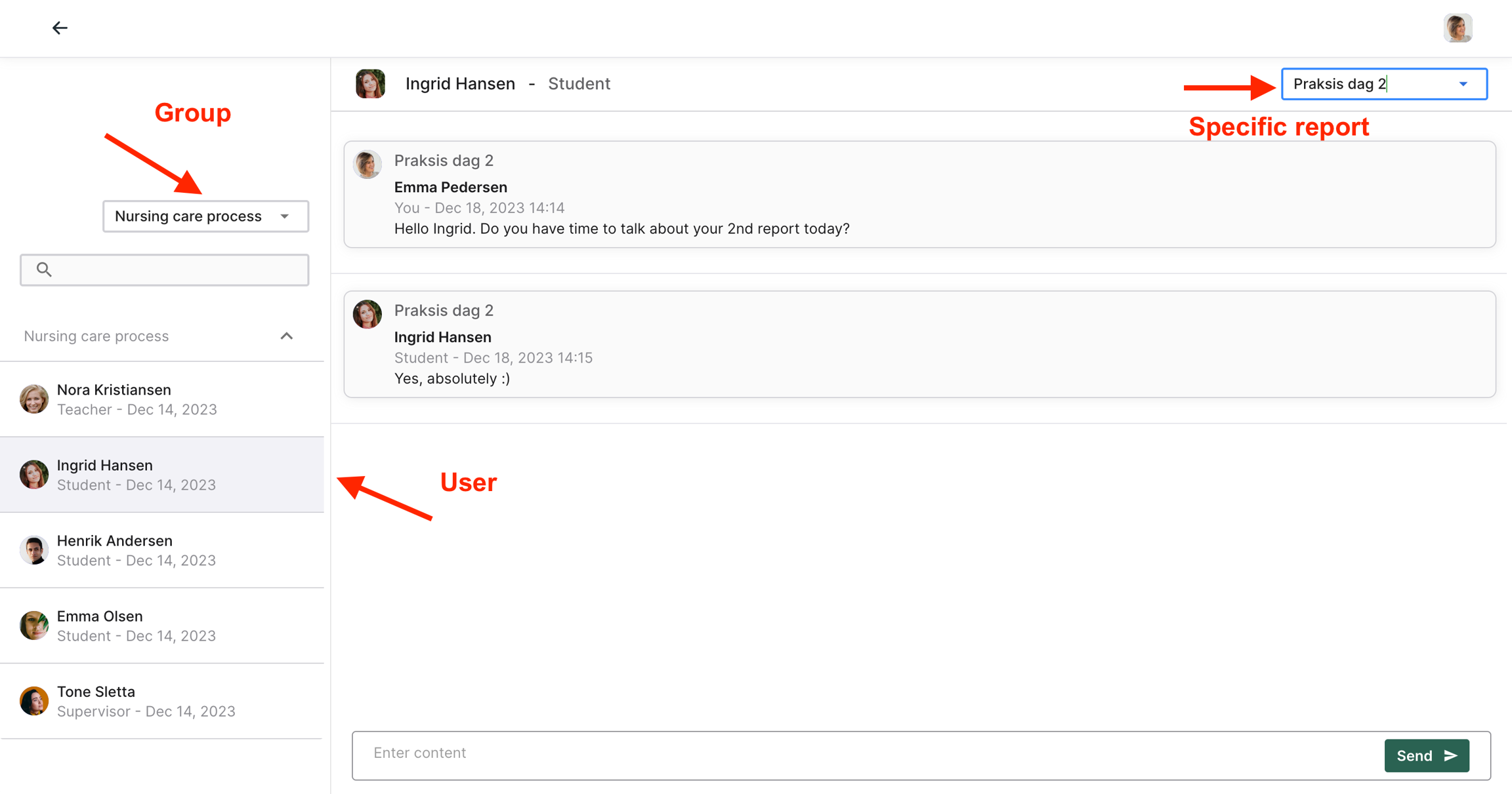 Gruppefiltre: Du kan få tilgang til meldingstjenesten innenfor gruppene dine og samhandle med andre gruppedeltakere som studenter, veiledere og lærere.