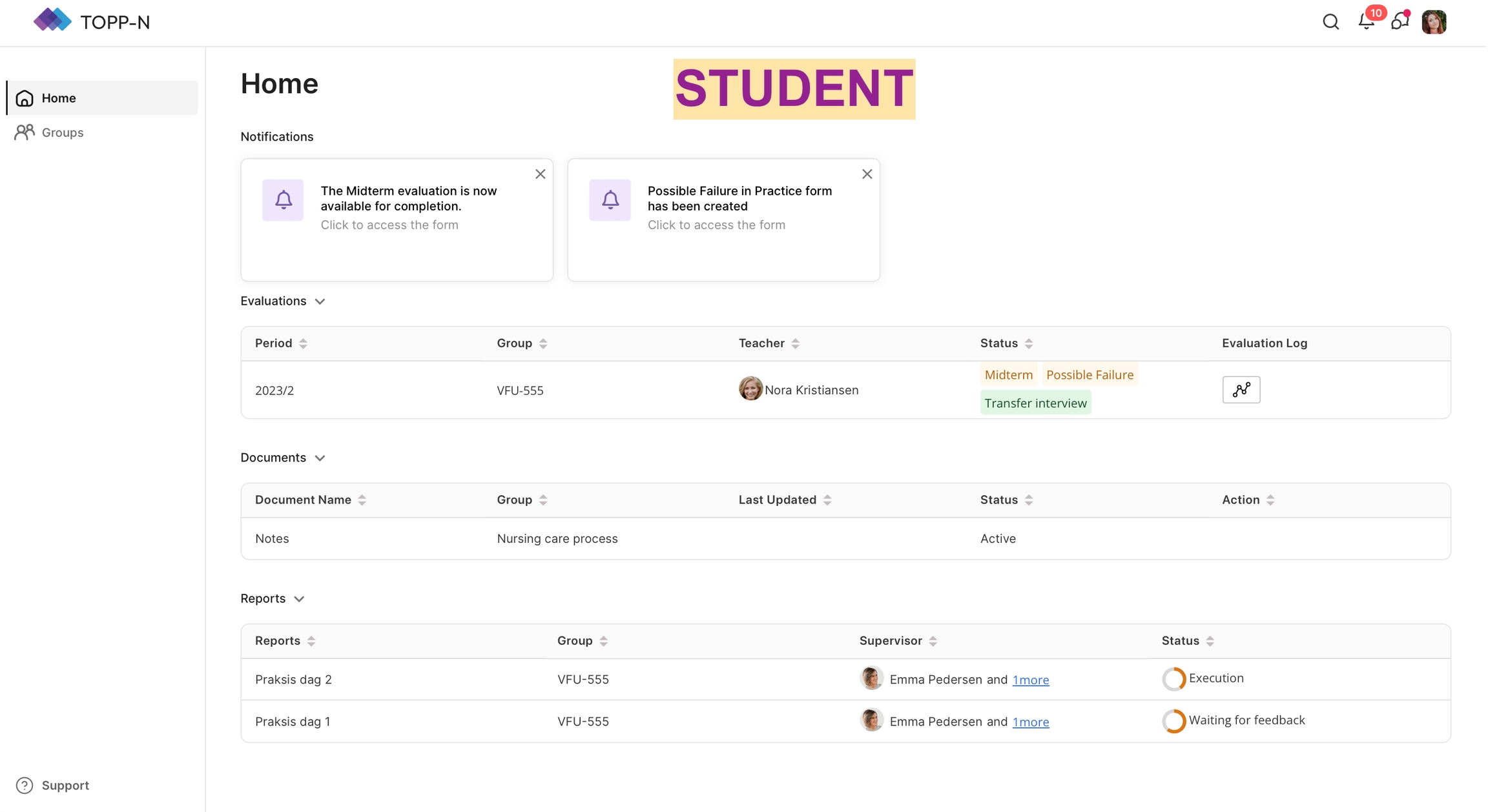 Denne delen vil gi deg en grundig oversikt over studentfunksjonene og funksjonalitetene tilgjengelige i vår TOPP-N nettapplikasjon. TOPP-N er designet for å forbedre læringsopplevelsen din, lette samarbeid og hjelpe deg med å holde deg organisert. La oss utforske hva du vil finne på din studentskjerm: