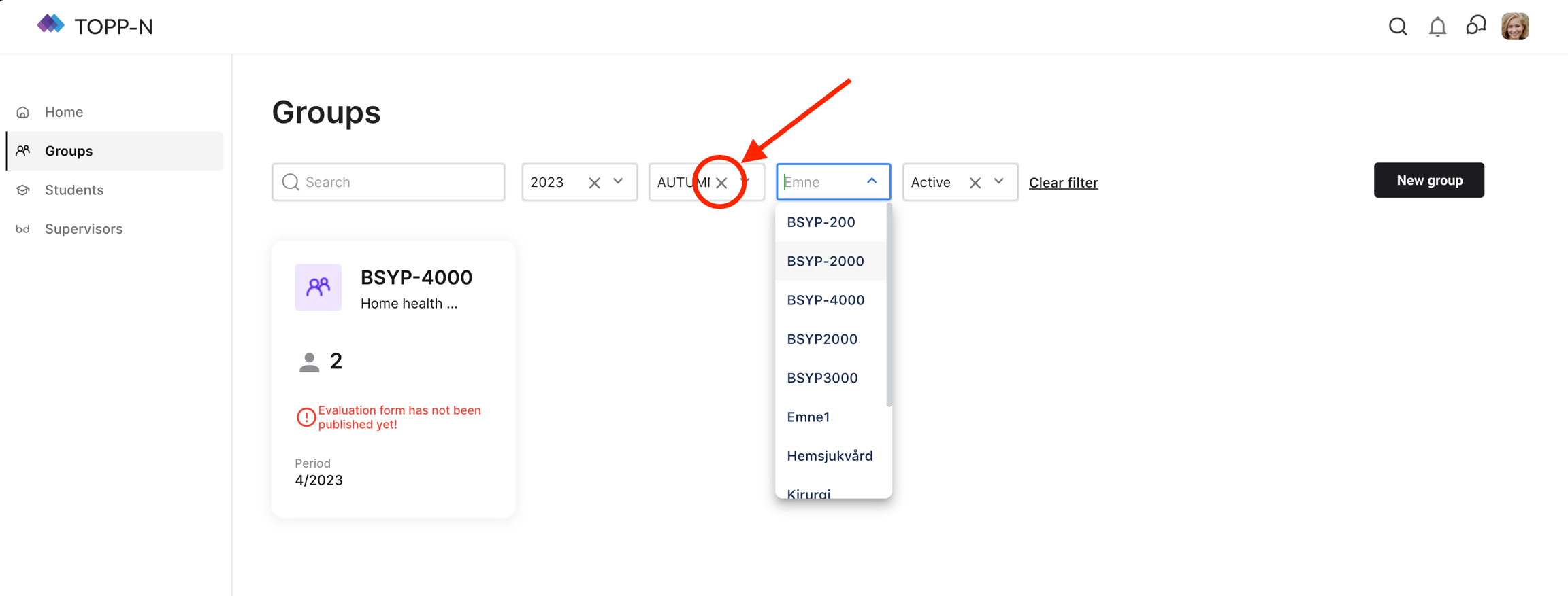 Semesterfilter (Høst/Vår): Velg det passende semesterfilteret for å kategorisere grupper etter studieterminen, enten det er Høst eller Vår.