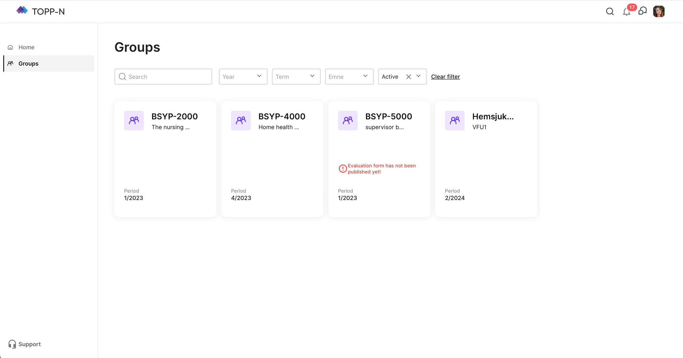Oppført informasjon: Hvert gruppekort vil vise nøkkelinformasjon som gruppetittel, emnekode, periode, og informasjon om vurderingsskjemaet ennå ikke er publisert.