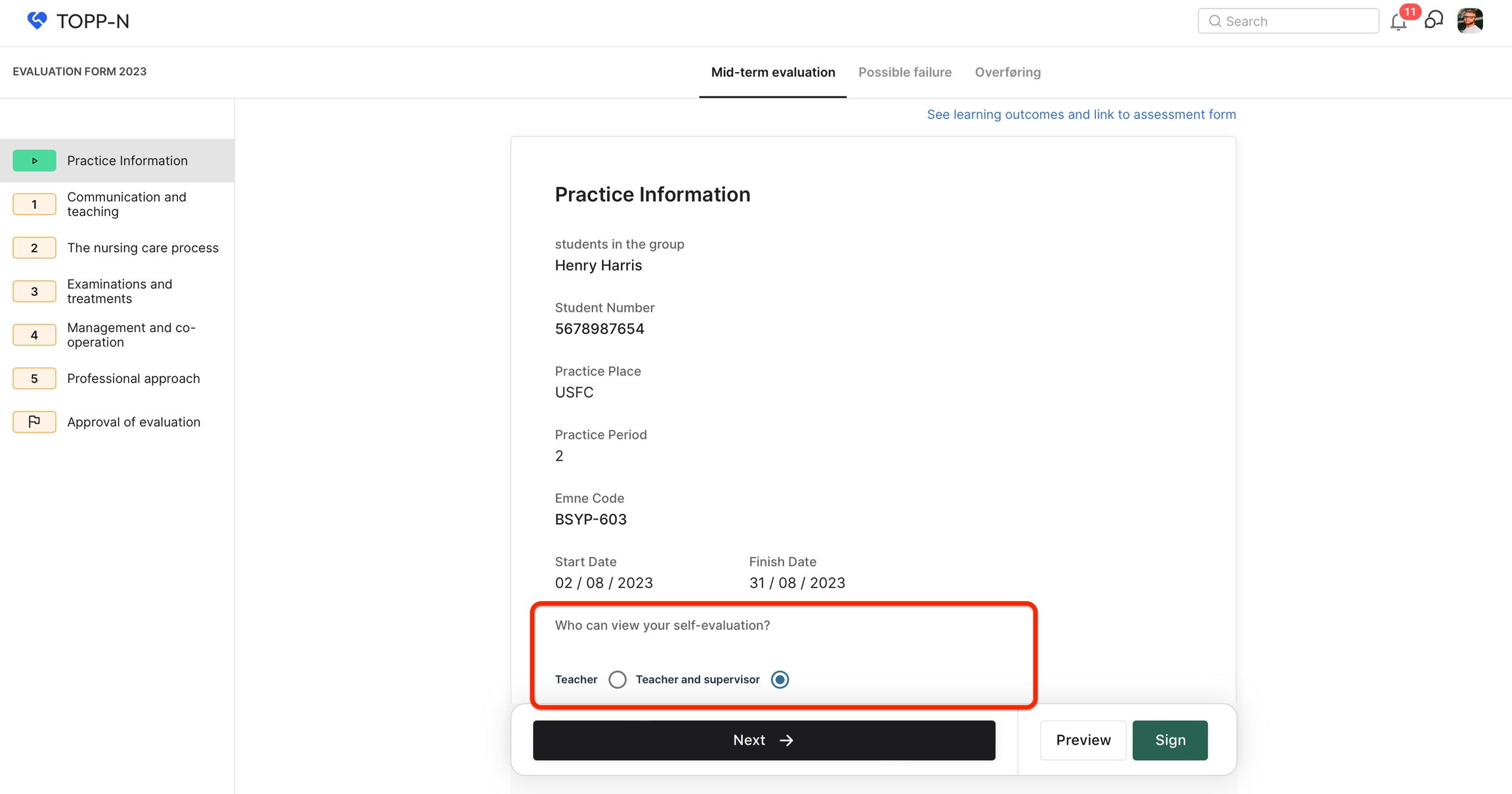 Praksislæreren vil håndtere denne delen. Vennligst gjennomgå de oppgitte praksisdetaljene. Hvis du har bekymringer, ta gjerne kontakt med læreren din for veiledning. Du må velge om din selv-evaluering skal være synlig bare for læreren din eller både for læreren og veilederen din. Merk: Denne funksjonen er tilgjengelig bare hvis den blir brukt i organisasjonen din.