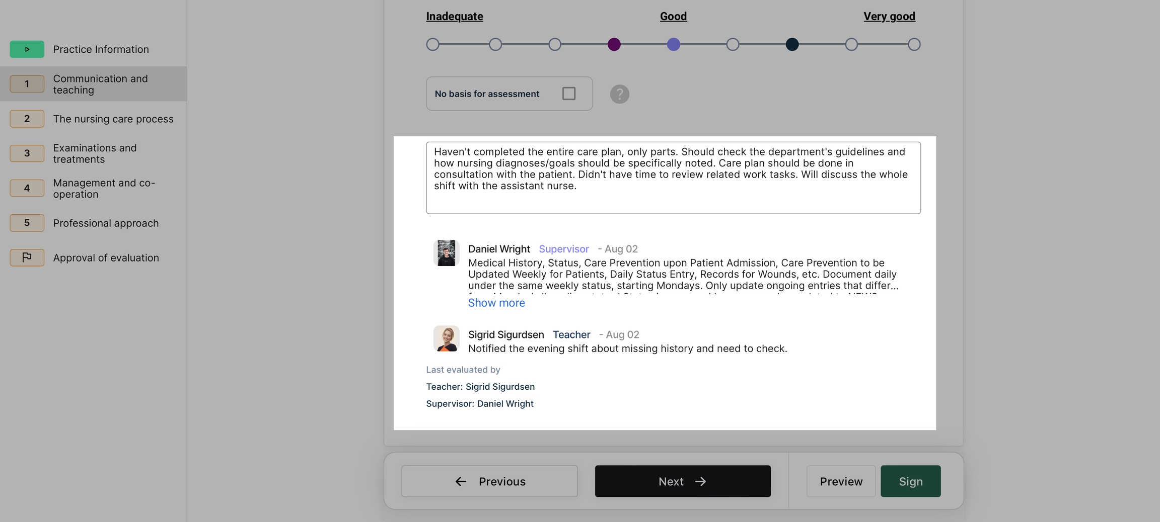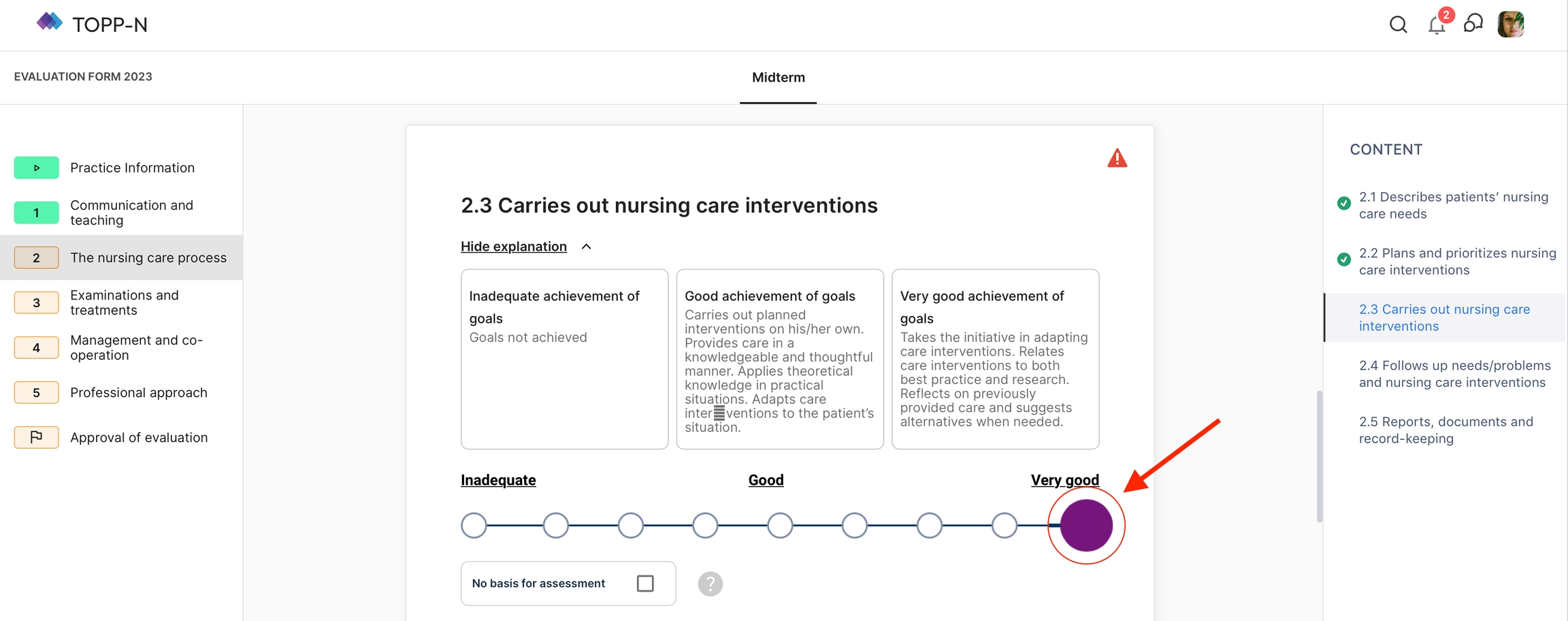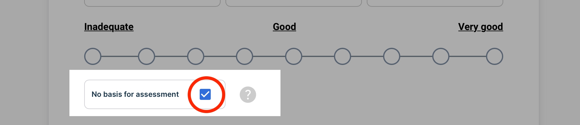 Hvert spørsmål inkluderer en avkrysningsboks (Ingen grunnlag for vurdering) som du kan merke hvis du mener at selv-vurdering for det spesifikke spørsmålet ikke gjelder for din situasjon. Dette kan være tilfelle hvis du ikke var involvert i relevante oppgaver i praksisperioden eller hvis du føler at engasjementet ditt var utilstrekkelig. Hvis du merker av denne boksen, blir kommentarfeltet obligatorisk.