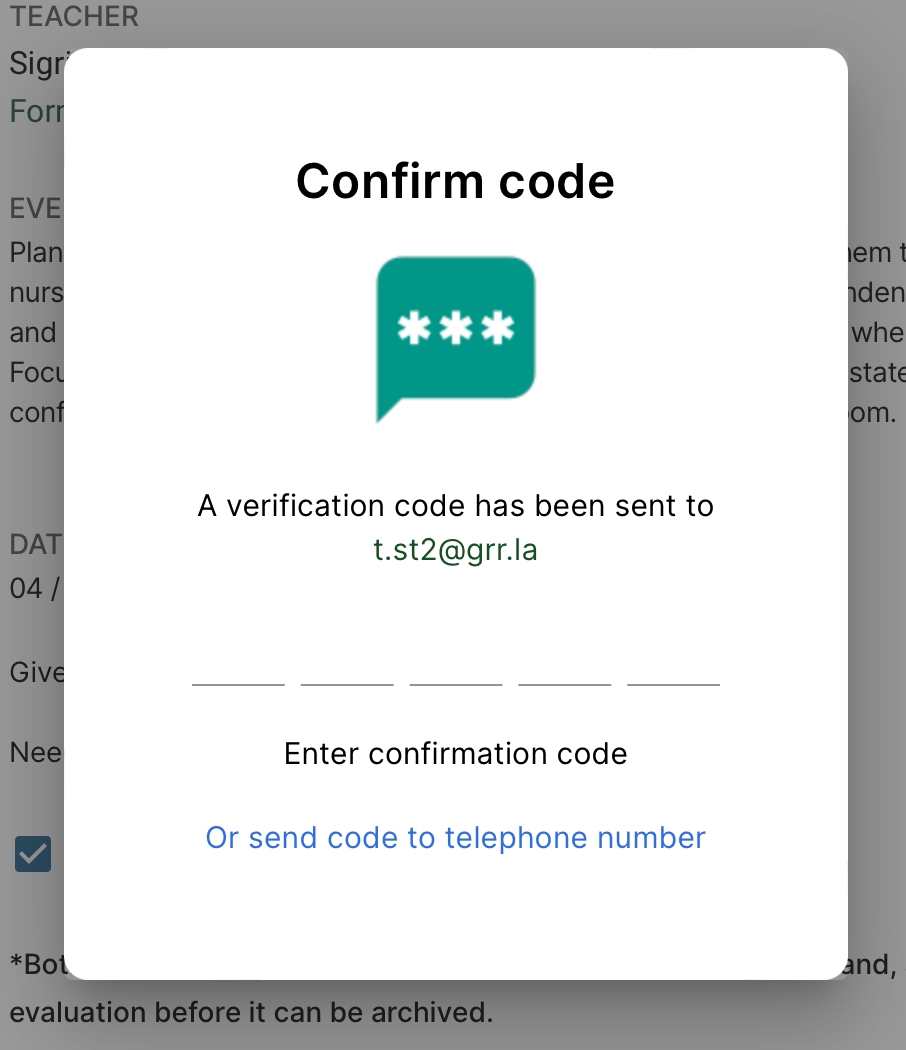 En pop-up vil vises og be deg om å angi bekreftelseskoden for signaturen din. Denne koden er allerede sendt til din registrerte e-postadresse. Hvis du foretrekker å motta koden via SMS på telefonen din, klikker du på 'Eller send koden til telefon nummer' -knappen på pop-up-vinduet.