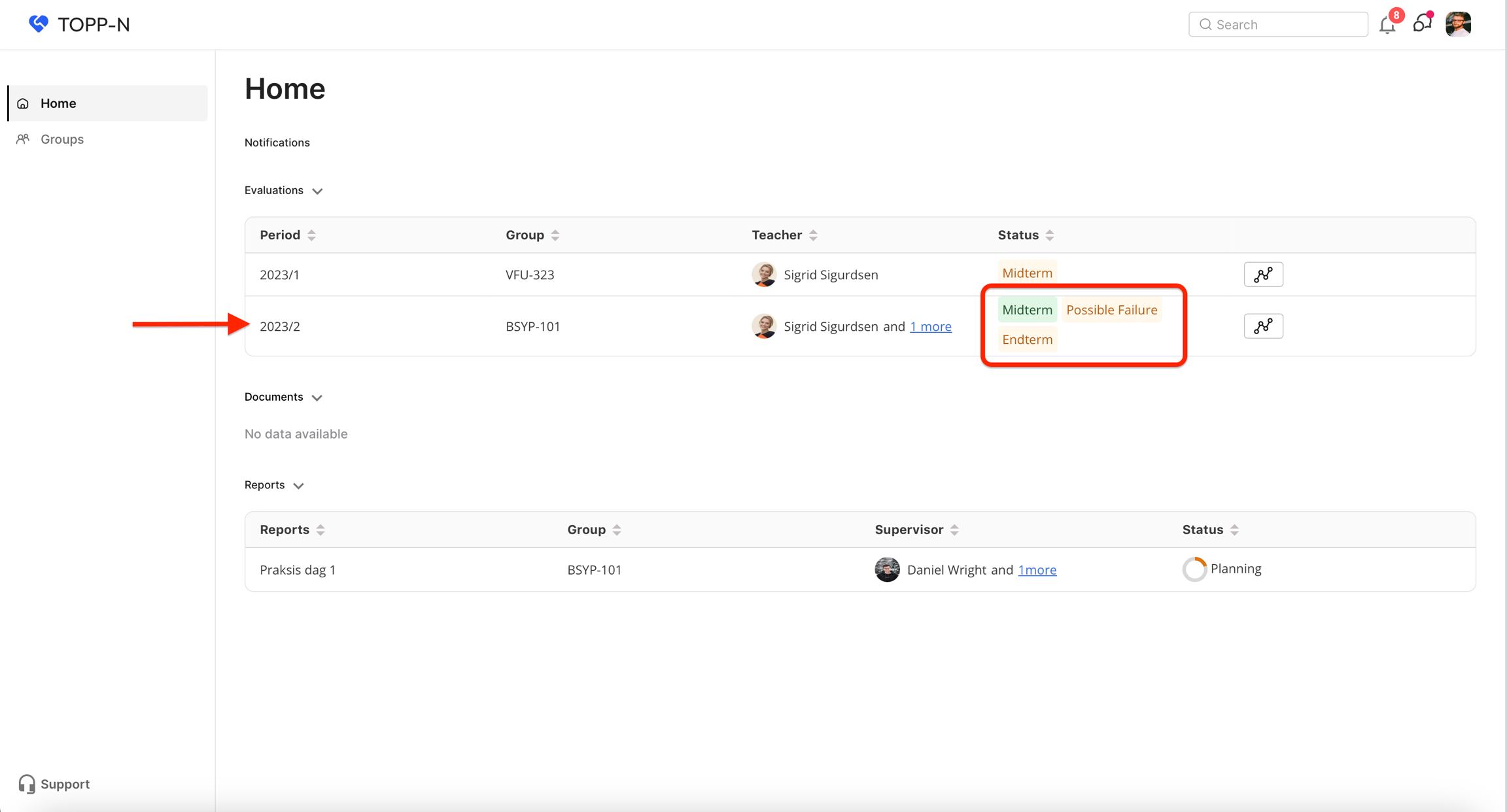 Finn ønsket vurdering ved å søke etter gruppenavn, lærer eller år/periode.
