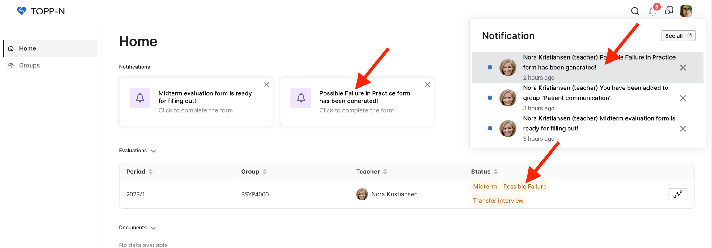 Enkel tilgang til skjemaet: Tilgang til skjemaet for 'Fare for ikke bestått i praksis' er enkelt. Klikk bare på enten kortet som vises på dashbordet ditt, eller varslingen i innboksen din, eller klikk på det angitte feltet på vurderingskortet ditt. Denne raske tilgangen sikrer at du kan gjennomgå skjemaet umiddelbart.
