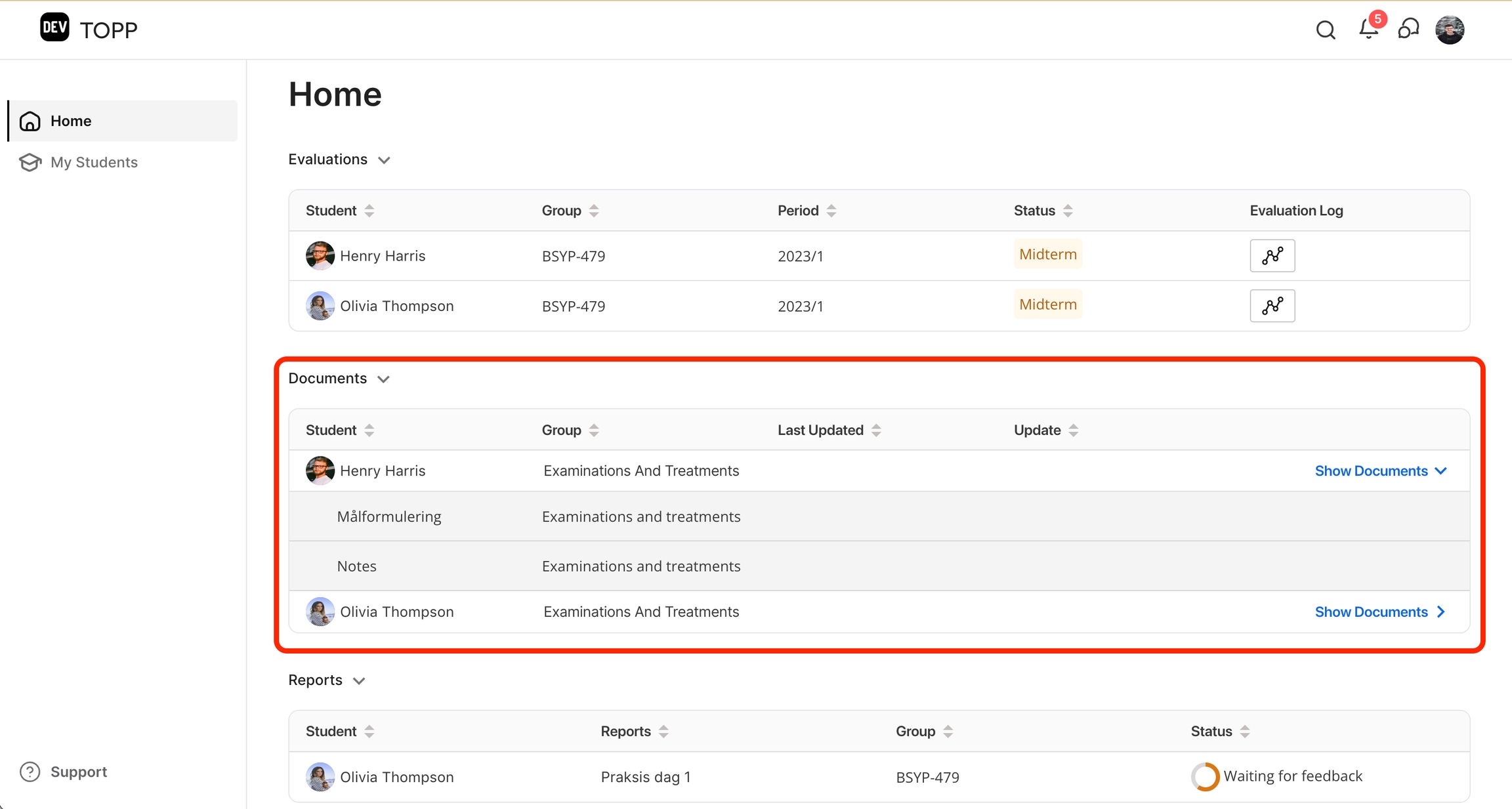 Se etter "Dokumenter"-delen, spesielt utformet for administrasjon av studentrelaterte dokumenter.