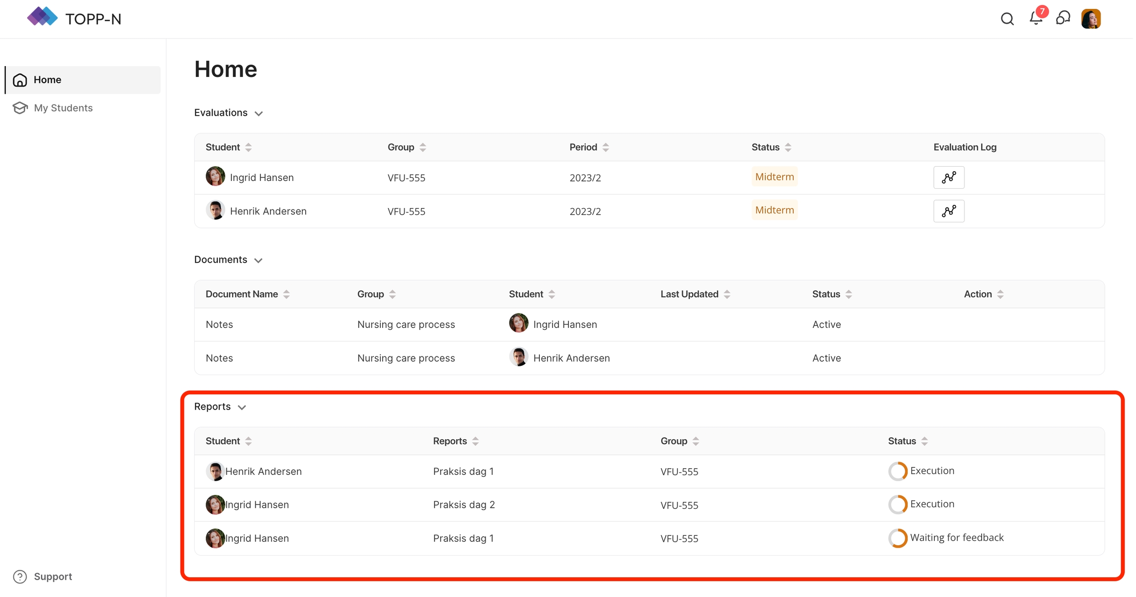 I denne delen finner du studentenes daglige rapporter som trenger tilbakemelding og vurdering.