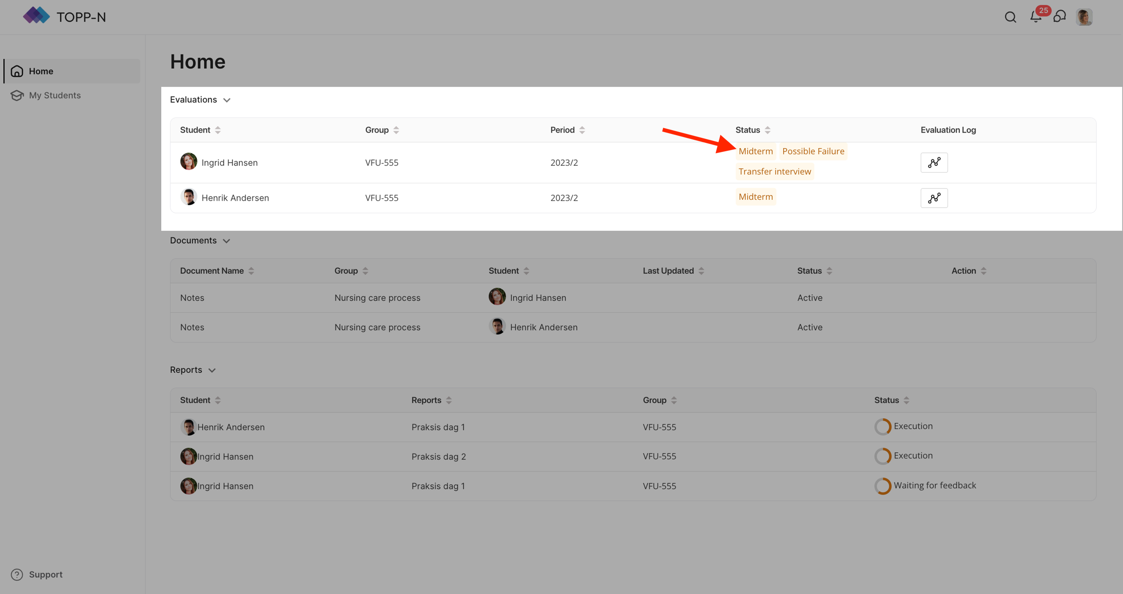 Under "Status," velg en spesifikk fase (f.eks. Midtveis, Sluttmål) for å bli dirigert til vurderingssiden, eller klikk på hele kortet for å få tilgang til siste fase for den ønskede studenten.