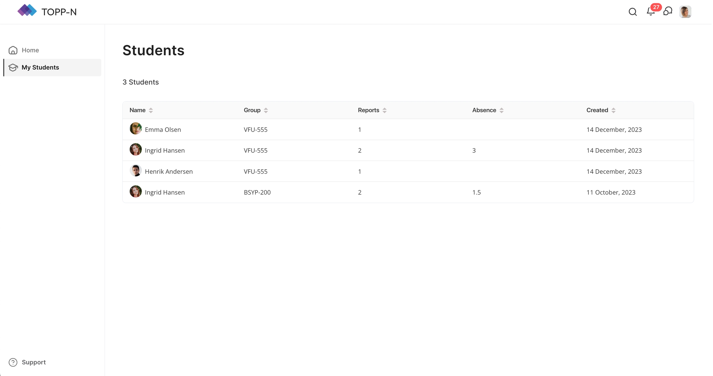 På fanen for Studenter kan du effektivt administrere og få tilgang til informasjon om alle studenter tilknyttet deres tilordnede grupper. Her er en gjennomgang av funksjonalitetene: